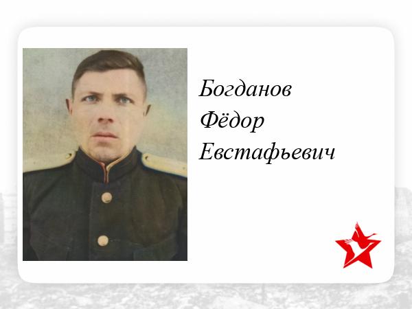 В годы Великой Отечественной войны на всех фронтах сражался наш народ. Фёдор Евстафьевич Богданов был на фронте с первых дней войны. Он уроженец деревни Краснинка Красноярского края. Здесь вырос и до призыва в ряды Красной Армии был работником в колхозе имени Молотова. Призвали его в сентябре 1940 года. Отправлен он был на Дальний Восток. По тем временам Фёдор Евстафьевич имел неплохое образование – 6 классов. При распределении по родам войск его определили в артиллерию, в гаубичный 102 горно-вьючный артиллерийский полк разведчиком-наводчиком. В то время полк дислоцировался в селе Новогеоргиевка, недалеко от города Уссурийска. Тогда была напряженная обстановка не только на Западе, но и на Востоке страны. Учились военному мастерству днем и ночью, постигая одну за другой военные специальности. 5 мая 1941 года в полку была объявлена военная тревога, дали три дня на сборы и погрузили в вагоны материальной части, боеприпасов. При подъезде к Харькову объявили, что полигон поступает в распоряжение Киевского военного округа и разгружается на старой границе, в Хмельницкой области. Штаб полка разместили в Волочиске. Не успев как следует устроиться, началась учеба. Но 14 июня 1941 года полк снова по тревоге был снят с места и передвинут в Тернопольскую область, на границу с Польшей. В бой с немецко-фашисткими захватчиками вступили в первый день войны. Враг наступал стремительно. Была прорвана оборона пограничников и пехоты. Вступили в бой артиллеристы. «Наши артиллеристы, – вспоминает Федор, – уничтожили немало вражеской техники и пехоты. Но враг был силен. Только разобьем одну колонну танков и следующей за ней пехоты, как надвигается другая». Через пять дней поступил приказ об отступлении. Враг уже сжимал клещи, обходя полк с севера и юга. В полку были большие потери людей, техники, много было раненых. Но большой дух не был утрачен. Пушки тащили на себе, так как лошади были убиты при первых бомбежках. Были в окружении. Не только тот полк, в котором воевал Ф.Е. Богданов, попал в такое положение. Люди соединились, и образовалась, сборная часть. Рядом сражались артиллеристы, летчики, кавалеристы, пехотинцы. Старший по званию командир принимал сборную часть и командовал. Большую роль, как вспоминает Фёдор Евстафьевич, играли комиссары и политруки. Они поддерживали боевой дух, первыми поднимались в атаку и погибали, как герои. К концу августа 1941 года много разрозненных частей было окружено и бойцы взяты в плен. Из окружения пытались выходить в одиночку или малыми группами. Их выслеживала авиация противника, бомбила маленькие группы, а с истребителей расстреливали даже одиночек. Так, Фёдор Евстафьевич и его товарищи, отступая, воевали до Полтавской области. В конце августа 1941 года в районном городке Белоцерковка Ф.Е. Богданов попал в плен. При нем был карабин, немало положил он из него врагов, и жаль было расставаться с ним до слез. Голодных пленных привели в деревню, оставили там прямо на улице под небольшой охраной, да и те на половину перепились самогоном, который им приносили местные женщины. «Много тогда пленных сбежало, – вспоминает Фёдор Евстафьевич, с ними и я, пробираясь ползком огородами. Я был вместе с капитаном. Мы некоторое время шли вместе, а потом решили разделиться и действовать по одиночке. Капитану не повезло, его поймали и повесили, а я еще д