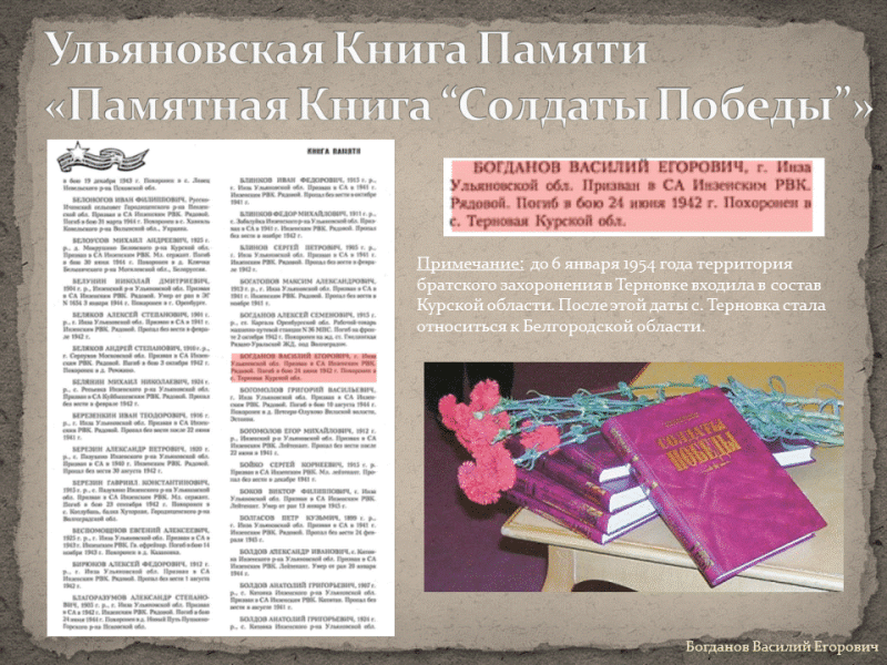 По рассказам моей бабушки Комаровой (Богдановой) Любови Егоровны, ее брат Богданов Василий Егорович погиб в бою в деревне Либникова (Липникова?, возможно, Липник – под Курском). Об этом ей сообщил его фронтовой товарищ.