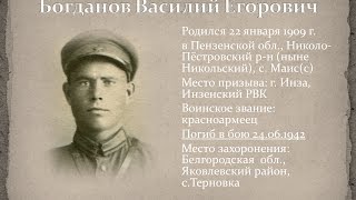 По двум сохранившимся фронтовым письмам можно установить, что Богданов Василий Егорович воевал в Ростовской области (Сальск) и под Сталинградом. Погиб в бою 24.06.1942 в Курской области.