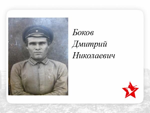 Боков Д.Н. родился в с.Веренка Кустанайской области.Родственники; отец Николай Андреевич Боков, мать Анна Ивановна Кривошеина,жена Ефросинья Ивановна Тимофеева 1900-1942г сын Боков Александр Дмитриевич, дочь Бокова Екатерина Дмитриевна, сын Боков Михаил Дмитриевич. 30.08.1941 года Федоровским Военным коммиссариатом Кустанайской области был призван в армию С марта 1943 считался без вести пропавшим. Погиб под Сталинградом, защищая подступы к Волге. Через 70 лет поисковики нашли место захоронения. Захоронен в братской могиле в Волгоградская обл, Городищенский район, с. Орловка." Братская могила воинов СА " орденов и медалей не имел. по данным поисковиков был в 66 армия 548 стрелковый полк.