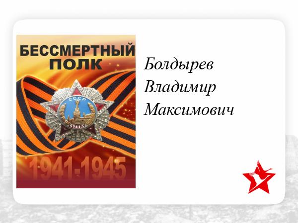 Из документов ЦАМО "Информация из документов, уточняющих потери" запись № 241 "Болдырев Владимир Михайлович, 1923 года рождения, уроженец села Колбино. Проходил службу в 43 ОСБр. Убит 29.05.1943 года. Захоронен в Краснодарском крае, Курганского района, х. Шедогуб."