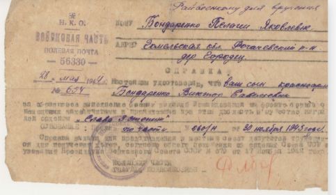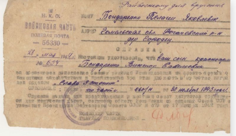 Мой прадедушка Виктор Савельевич был участником ВОВ 1941-1945 год. Он служил в партизанский войсках с регулярными частями Красной армии освобожадл город Гомель, где был тяжело ранен во время военных действий. Но к сожалению, не выдержав операции, он скончался 26 апреля 1944 года. Посмертно был награждён Орденом славы lll степени. Он был отличным художником, да и человеком он был прекрасным. По рассказам моей бабушки он никогда не осятавлял людей в беде, всегда помогал, чем только мог.