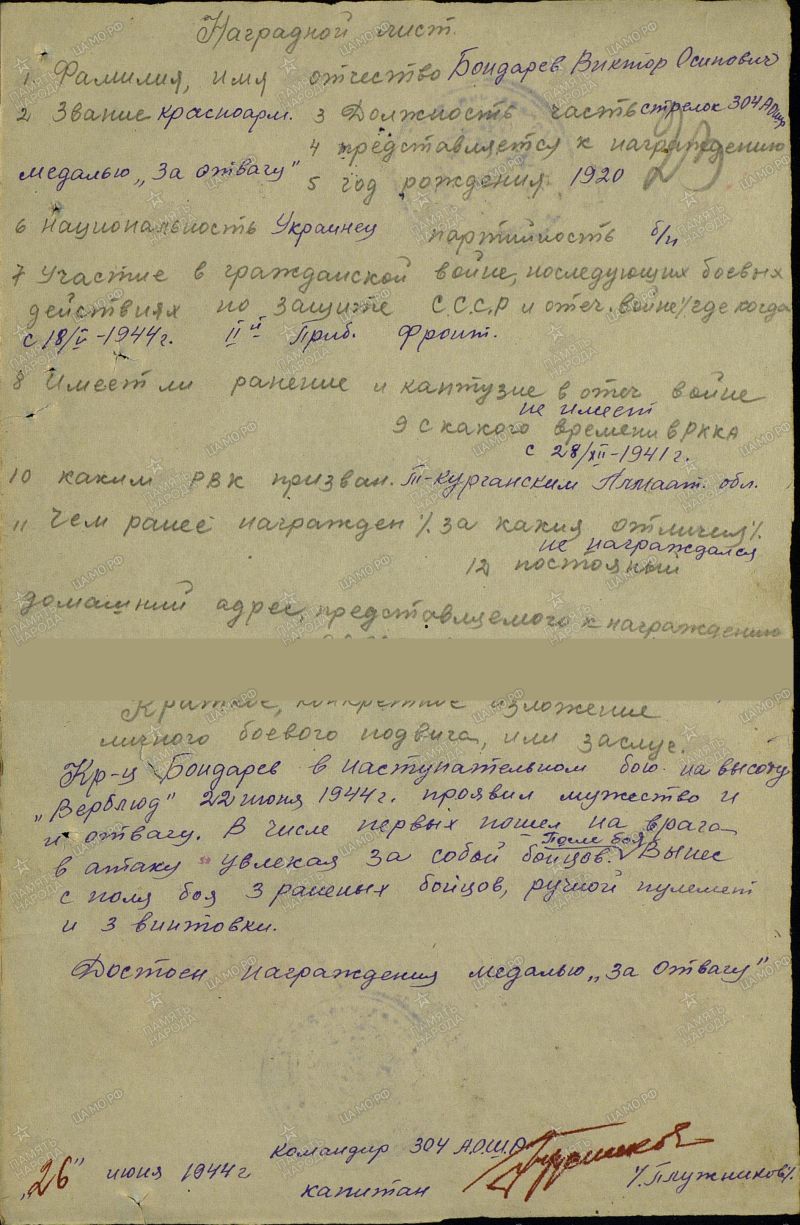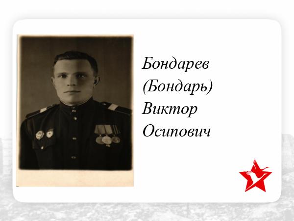 Бондарь Виктор Осипович уроженец села Леухи Давшевского р-на Винницкой области УССР. В 1940 году как комсомолец-активист вместе с молодой супругой Прасковьей и маленьким сыном Петей переезжают в Алма-Атинскую область на освоение Казахстанских степей. Но уже через год ему приходится оставить семью и уйти на фронт, записавшись добровольцем в ряды РККА. Волею судьбы или же этому виной человеческий фактор, но при оформлении документов Талды-Курганским РВК вместо фамилии (Бондарь) указывают фамилию Бондарев, в следствии чего во всех документах он будет как Бондарев Виктор Осипович.