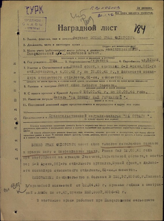 12 мая началось Генеральное наступление наших войск. Это было Харьковское направление, Барвенково-Лозовая. В бою он получил тяжелое ранение, но успел подбить три фашистских танка связками гранат. За это он был награжден Орденом Славы 3 степени. Про награду он узнал только в 1951 году и получил её в военкомате города Фрунзе. Раненного его вынесли с поля боя и отправили в госпиталь. По дороге он часто терял сознание, так на одной из остановок его сняли с поезда, как умершего. На улице было холодно, и он пришел в себя. Когда стали оформлять документы, как на умершего, он застонал. Все, кто был рядом, переполошились, быстро его занесли, так он попал в госпиталь в городе Ташкент. Из Ташкентского госпиталя направили его долечиваться в Киргизию и закрепили за Панфиловским военкоматом. Рана у него была не заживающая, сильно сочилась, шел неприятный запах. Прадед часто менял повязки. Постирает бинты, высушит и снова перебинтовывает. Люди, которые встречались ему по дороге, здоровались с ним. Говорили: "Здравствуй, Ваня", он удивлялся: «Откуда его знают?» Так сидел он возле арыка, стирал свои бинты. К нему подбежала девочка и как закричит: " Наш Ваня вернулся!" Все к нему подходили, как к знакомому, расспрашивали. Он не мог ничего понять. Потом прибежала женщина посмотрела и говорит: "Ваня, да не мой...".