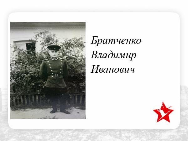 Братченко Владимир Иванович родился в Буденновске. В 1943 году его призвали и только в 1951 году он вернулся с войны. Участвовал в Ясско-Кишиневской стратегической наступательной операции.