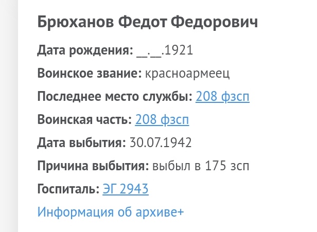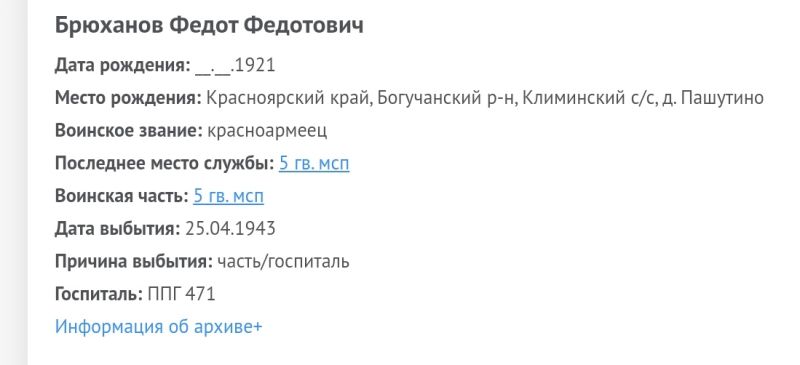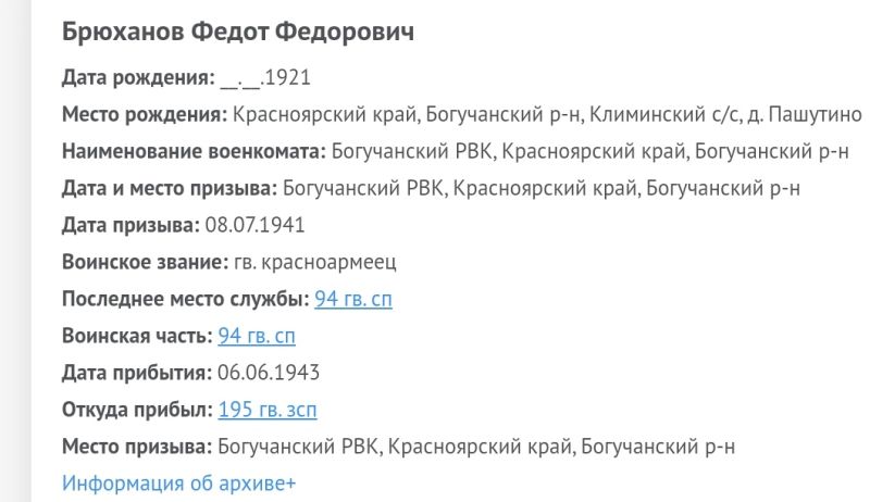 Брюханов Федот Фёдорович, 1921 (1922) г. р. Место рождения Красноярский край, Богучанский район, д. Пашутино. Призван Богучанским РВК в 1941 году. Гв.красноармеец. Наводчик миномета. В/ч 5 гв. мсп 3 гв. мсд., 660 сп 220 сд., 94 гв. сп 30 гв. сд. Трижды ранен. Награждён медалью За боевые заслуги. Мать Брюханова Лидия Ульяновна.