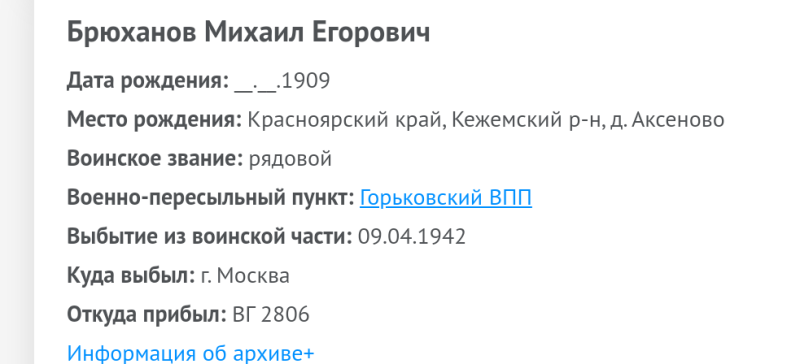 Брюханов Михаил Егорович, 1909г.р Место рождения Красноярский край, Кежемский район, д.Аксеново. Призван Кежемским РВК в 1941году. Красноармеец. Стрелок. В/ч 91 гв.сд.Участник обороны Москвы. Ранен в 1942 году,ЭГ 2806 (г.Горький) .Из госпиталя выбыл 9.04.1942 в Москву в распоряжение подполковника Шмакова. Тяжело ранен в 1943 году.ППГ 102,220.ЭГ 1757 (по справочнику Солдат.ру дислокация Калининская область),3086 (Ивановская область).Комиссован по ранению 12.01.1944 года.