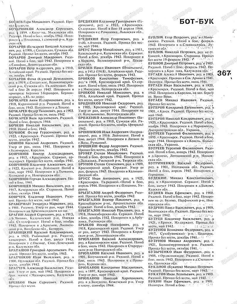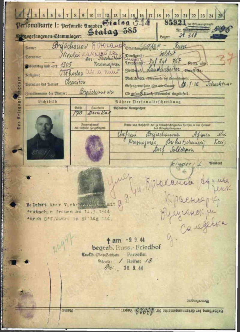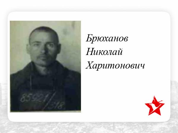 Брюханов Николай Харитонович, 1905 г. р. Место рождения Красноярский край, Богучанский район, д. Пашутино. До войны жил в д. Заледеево Богучанского района. Призван Богучанским РВК в январе 1942 года. Последнее письмо родные получили в июне 1942 года. Попал в плен 20.07.1942 года в Ростовской области, г. Каменск-Шахтинский, в районе. Шталаг Vlll F (318). Погиб в плену 9.09.1944 года. Похоронен Германия, зем. Саксония, Цайтхаин (Полигон), блок 1, ряд 18. Жена Брюханова Афимья Никитична.