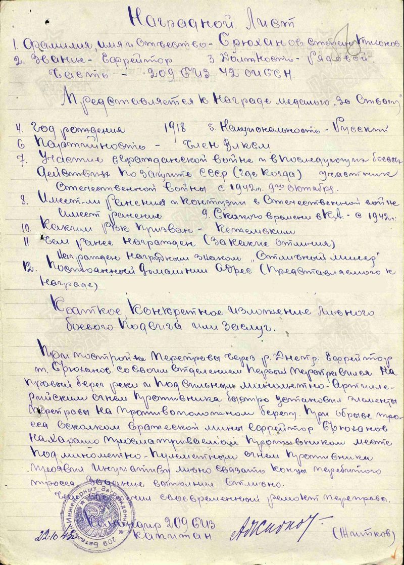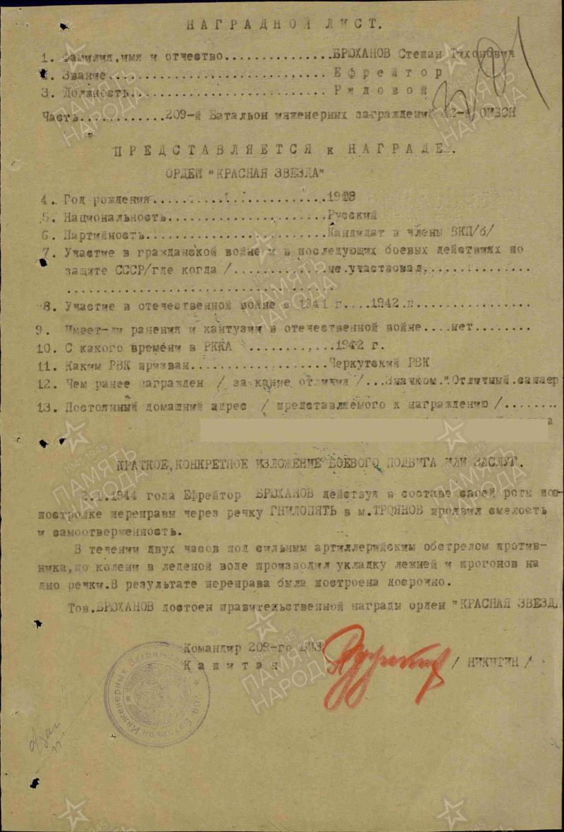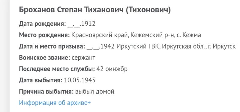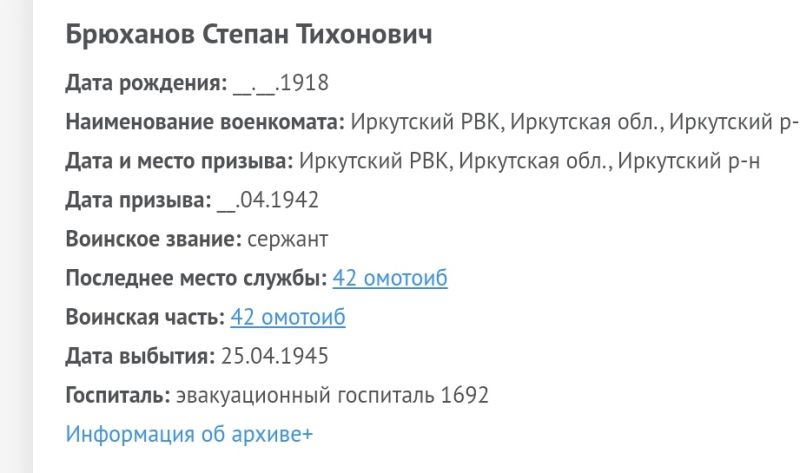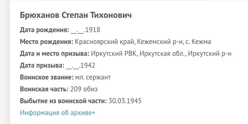 Брюханов Степан Тихонович, 1918 г. р. Место рождения Красноярский край, Кежемский район, с. Кежма. Призван Иркутским ГВК, г. Иркутск в 1942 году. Ефрейтор. Сапер. В/ч 42 оибсн 3 гв. ТА. Награждён знаком Отличный сапер, медалью За отвагу, медалью За боевые заслуги, медалью За Победу над Германией в Великой Отечественной войне 1941-1945 гг. Тяжело ранен в апреле 1945 году. ЭГ 1692 (по справочнику Солдат. ру дислокация Германия. г. Ельс). Комиссован по ранению.