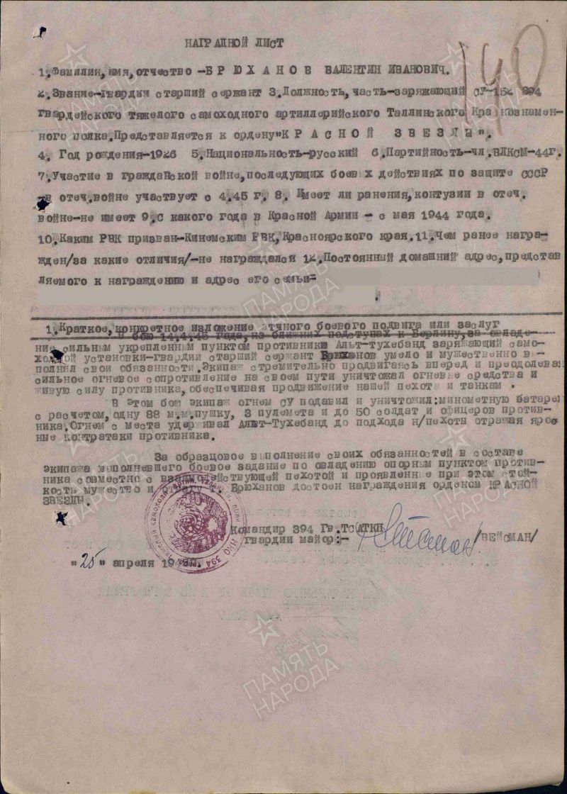 Брюханов Валентин Иванович, 1926г.р Место рождения Красноярский край, Кежемский район, с.Кежма Призван Кежемским РВК 8.06.1944 года.Гв.ст.сержант. Заряжающий. В/ч 394 гв.тсап 8 гв.А.Нагржден орденом Красной Звезды, медалью За Победу над Германией в Великой Отечественной войне 1941-45гг, юбилейным орденом Отечественной войны 1 степени. Мать Брюханова Наталья Александровна.