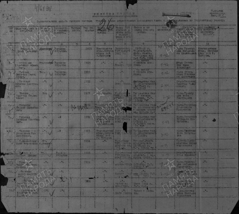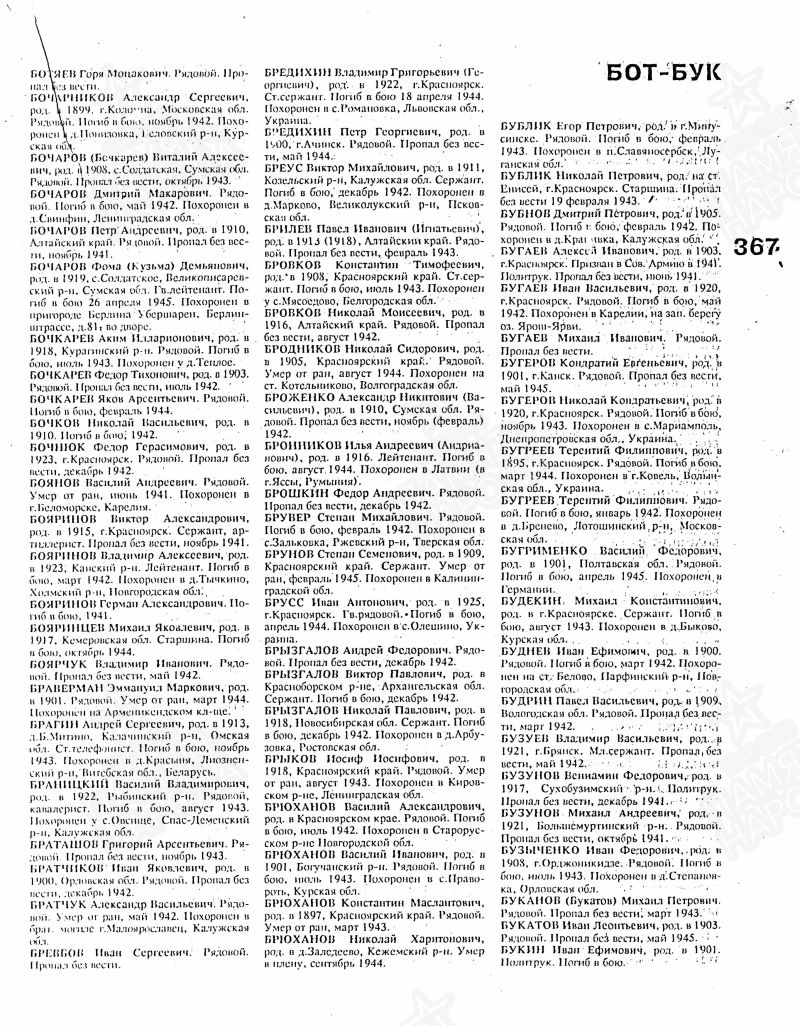 Брюханов Василий Александрович, 1903 г. р. Место рождения Красноярский край, Богучанский район, д. Пинчуга. Призван Богучанским РВК в 1942 году. Красноармеец. Стрелок. В/ч 312 сп 26 сд. Последнее письмо родные получили в марте 1942 года. Признан пропавшим без вести в мае 1942 года. Убит в бою 31.07.1942 года. Похоронен Ленинградская область, Старорусский район, д. Гридино, западнее 2 км. Жена Брюханова Дарья Степановна.