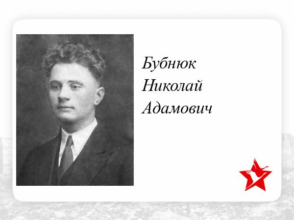 Уроженец Ровенской области, с. Коловерть.Призван на войну 24.06.1941 года , 3 августа 1941 года вместе с родным младшим братом Бубнюком Евменом Адамовичем.и еще пятью односельчанами был отправлен из 13 запасной стрелковой бригады на Урал, в г. Чебаркуль , на Черабкульский з-д (УРВО). Согласно раппорта ВПП , все семеро попали в один 16й/(№765) рабочий батальон вo 2 роту. 1 взвод...Батальон в количестве около тысячи человек состоял в основном из украинцев,выходцев из западных областей. Дальнейшая судьба моего деда пока неизвестна. Пропал без вести в апреле 1944го...