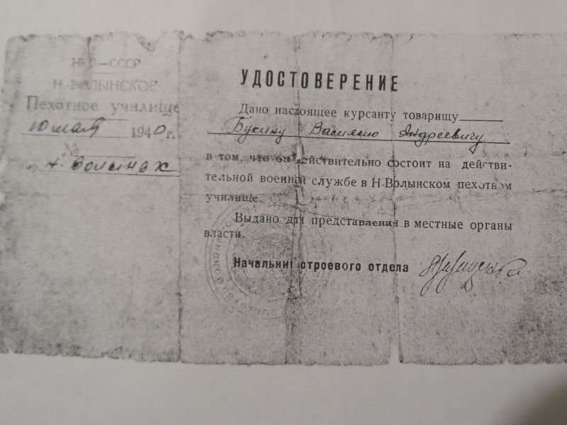 Он был курсантом и состоял на действительной военной службе в Ново-Волынском пехотном училище(удостоверение датировано10-ым мая 1940года)