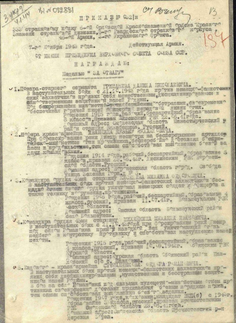 Бунин Федор Сергеевич, 1899г.р Место рождения г.Москва. До войны жил в Красноярском крае, Кежемский район, с.Кежма. Семьи нет.Призван Кежемским РВК в 1942году. Ефрейтор. Связист. В/ч 577 окшр. Пропал без вести 3.03.1943 года.Украина. ЖИВ. В/ч была в окружении, выходили мелкими группами. В/ч 333 сп 6 сд.Награжден орденом Красной Звезды (20.09.1943), медалью За боевые заслуги (7.11.1943).