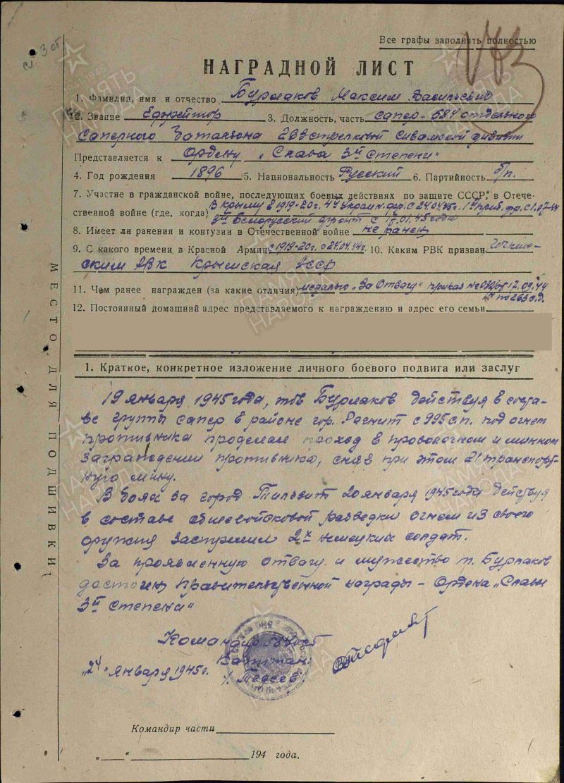 19 января 1945 года, в районе города Рагнит, под плотным огнём противника, действуя в составе группы сапёров, товарищ Бурлаков проложил проход через проволочные заграждения и минные поля. Вручную, в боевой обстановке, он обезвредил 21 транспортную мину, обеспечив безопасное продвижение 995-го стрелкового полка. Этот подвиг позволил наступающим силам успешно развить атаку и занять ключевые позиции.