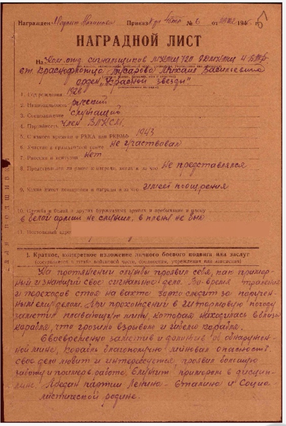Нахимова. В наградном листе сказано: « На протяжении службы проявлял себя,