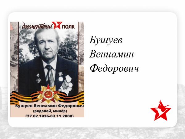 Бушуев Вениамин Федорович (27.02.1926-03.11.2008)(рядовой, минёр) родился в деревне Ивашевская Даровского района в крестьянской семье. 4 класса закончил в селе Шадрино Опаринского района, затем продолжил учиться в Красносельской средней школе Даровского района. В 1941г. закончил 7 классов, затем работал в колхозе. В августе 1942г. был мобилизован школу ФЗО в п. Октябрьский Мурашинского района. Затем работал на лесозаводе №41 (объект военный) в Нововятске. В 1943 поступил в Кировское ФЗО и в сентябре этого же года был направлен в Москву на завод «Газоаппарат».