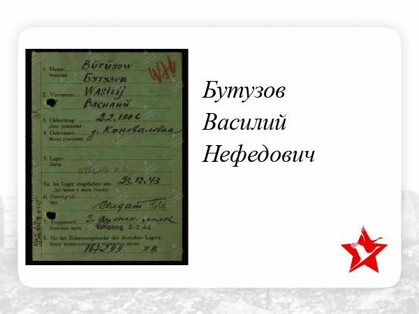 Бутузов Василий Мефодиевич-красноармеец 3-го дорожного полка попал в плен под г. Киевом14.09.41г. Находился в Шталаге 10Е под номером 167299.