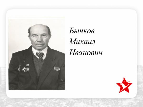Бычков Михаил Иванович родился 10 августа 1920 года. До войны работал на КМК в городе Новокузнецке токарем. В 1940году был призван на службу в пограничные войска Дальнего Востока. В ноябре 1942 года в составе 106-й стрелковой дивизии переброшен в район боевых действий. Был минометчиком. В июле 1943 года в боях на Курской Дуге был тяжело ранен. Попал в госпиталь и в декабре 1943 года был комисован как инвалид 1 группы. Ушел из жизни в возрасте 76 лет.