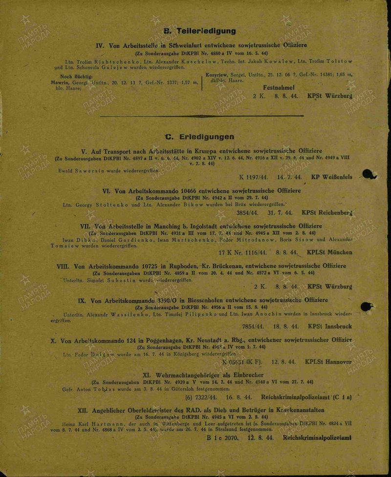 « VI. Сбежавшие советские офицеры из рабочей команды 10466 (По специальному выпуску DtKPBl № 4942 a II от 29.7.44) Лейтенант Георгий Столтенко и лейтенант Александр Быков были снова задержаны в Брюксе.