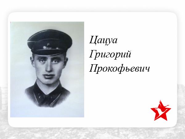 Мой дядя- Цацуа Григорий (Гриша) Прокофьевич- был очень талантливым человеком; хорошо учился, с отличием окончил ср. школу, поступил в Тбилиский медицинский институт. Был призван с студенческой скамьи в 1940г. ( с последнего курса) в Латвию, г. Лиепаю. Последнее письмо семья получила 15.05.1941г; чувствовалась тревога. Пропал без ввести.... Родители ждали солдата всю свою жизнь!.. Если б не было войны.....