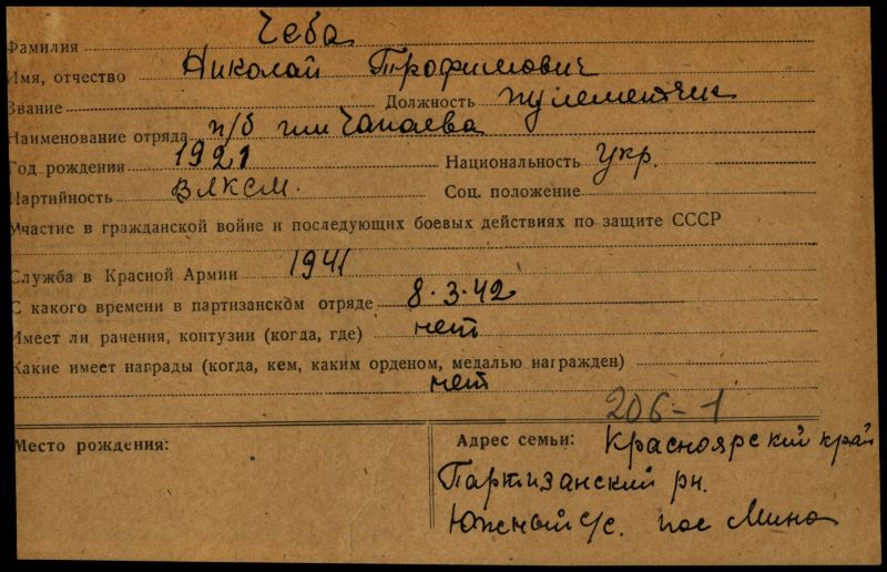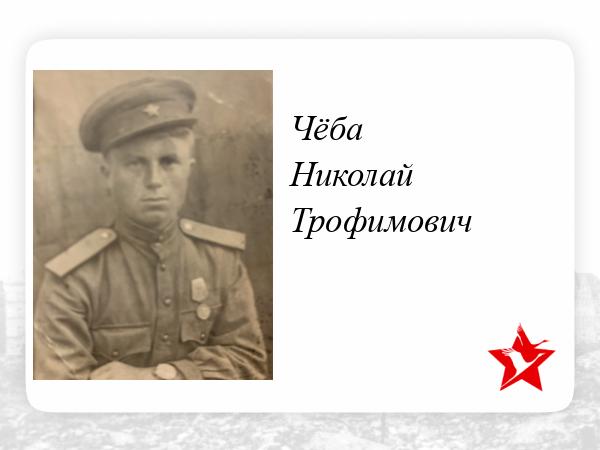 Чёба Николай Трофимович был призван в Советскую Армию в апреле 1941 году, а уже с 27 июня был на фронте под Харьковом, где его часть с боями отступала до Брянской области. С октября по декабрь находился в окружении на оккупированной немцами территории. Находясь в окружении, начал организовываться партизанский отряд им. Чапаева, в котором находился в качестве бойца пулеметчика. Участвовал в боях с немецко-фашистскими захватчиками и изменниками родины. Был награжден медалью «За боевые заслуги», медалью «Партизану Отечественной войны» 2 степени, медалью «За победу над Германией в ВОВ 1941-1945 гг»