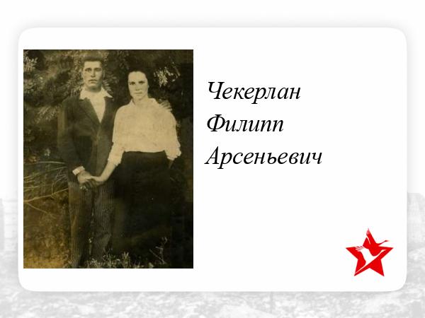 Вместе с тобой погибли миллионы советских солдат, тысячи твоих однополчан, сотни твоих земляков и два твоих родных брата: Чекерлан Пётр Арсеньевич (1907) и Чекерлан Роман Арсеньевич (1921).