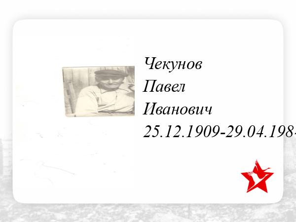 Своего дедушку, Чекунова Павла Ивановича, я запомнила как человека очень трудолюбивого, доброго, спокойного. У них с бабушкой, Чекуновой Надеждой Яковлевной, всегда было большое хозяйство. Они воспитали шестерых детей. Он очень любил природу, был хорошим охотником и рыбаком, свою любовь он привил и моему папе- Чекунову Анатолию Павловичу, а он -моим детям, своим внукам. Мы всегда с трепетом вспоминаем его. 29 апреля 1984 года его не стало.