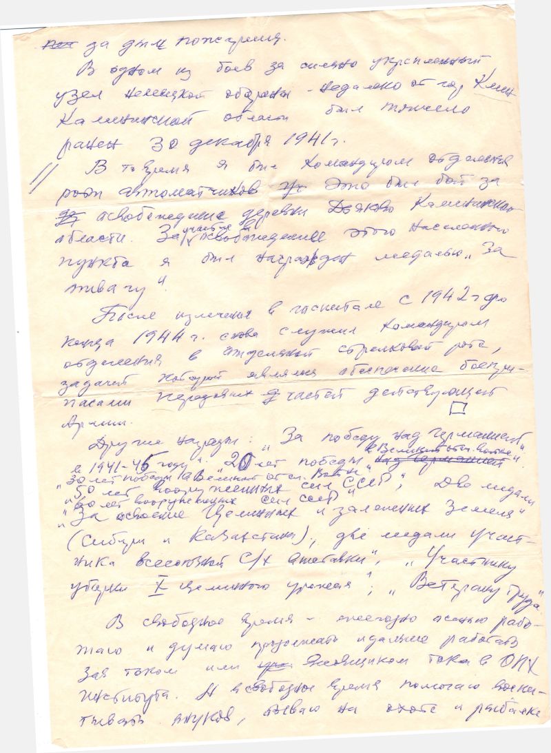 С сентября 1941г. воевал командиром отделения в составе 1253-го стрелкового (Сибирского) полка 10-й (бывшей 30-й) Гвардейской Армии на Западном (позднее Калининском) фронте, где участвовал в обороне Москвы и был тяжело ранен 30 декабря 1941г. в бою за д. Дьяково (вблизи от г. Лотошино Московской области. Ныне не существует). Деревня делилась дорогой на две стороны. Непосредственно перед атакой был назначен командиром отделения (его командир сослался на кишечный недуг). С приказом стрелять в перёд (создать плотный огонь) солдаты пошли в бой. С колокольни соседней деревни Колицино работал вражеский снайпер, он-то, по видимому, и выстрелил в деда. Разрывной пулей разбило приклад ППШ. Осколком выбило глаз и пробило шею. В результате дед был тяжело ранен и размещён на окраине деревни в каком-то сарае с другими ранеными бойцами. Там он познакомился с солдатом, который был ранен в ногу. Тот предложил уходить далее к своим, ведь деревня снова может перейти в руки врага. Они пошли в обнимку: дед тащит товарища, а товарищ смотрит, указывая направление. Позже это место было занято врагом. Можно себе представить, что стало с ранеными... Жаль, не известно имя того бойца...