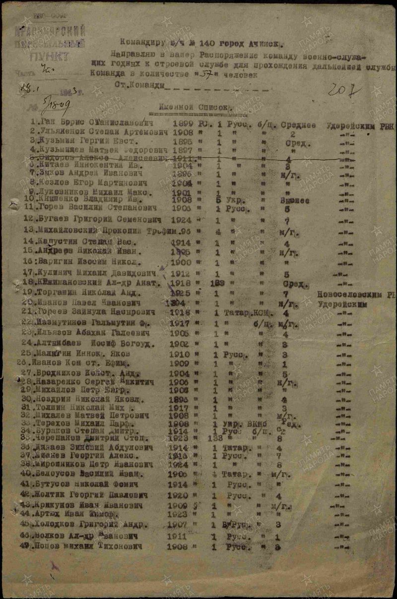 Черепанов Дмитрий Степанович, 1923 г. р. Место рождения Красноярский край, Пировский район, с. Пировское. Призван Удерейским РВК в марте 1923 года. Красноармеец. Стрелок. В/ч 38 сд. Убит в бою 14.09.1943 года. Похоронен Украина. Полтавская область, д. Н.Бутовка. Отец Черепанов Степан Семенович.
