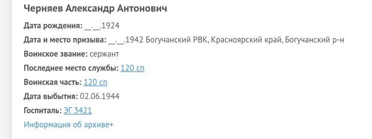 Черняев Александр Антонович, 1924 г. р. Место рождения Красноярский край, Богучанский район, д. Пинчуга. Семья репрессирована в 1930 году. Призван Богучанским РВК в 1942 году. Мл. сержант. Стрелок. В/ч 561 овхз ХС БО ТОФ. В 1943 году передислоцирован на Западный фронт. В/ ч 79 уминп., 120 сп 69 сд. Тяжело ранен в июне 1944 года. ЭГ 3421. Комиссован по ранению. Награждён медалью За Победу над Германией в Великой Отечественной войне 1941-1945 гг., юбилейным орденом Отечественной войны 1 степени.