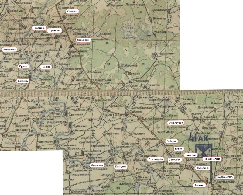 05 августа 1942г. 8 мотострелковая бригада и 93 танковая бригада, следуя в авангарде 8 танкового корпуса, из района Погорелое Городище, имели задачу- к 18-30 захватить рубеж Зеваловка- Пруды- Хлепень, блокировав р.Вазуза, и удерживать его до подхода главных сил корпуса.
