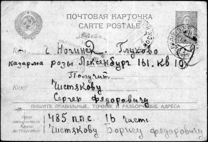 Последнее письмо домой написал 19 октября 1942г. Адрес воинской части- полевая почтовая станция 485- 9 гвардейской стрелковой дивизии.