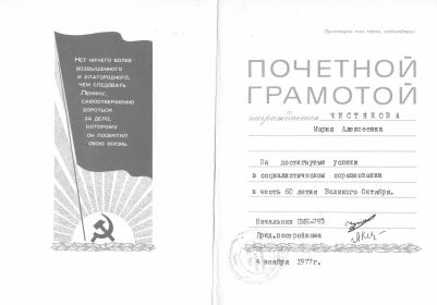Моей маме присвоили звание члена «Коллектива коммунистического труда». Она получала благодарности и почетные грамоты за свой непомерно тяжелый труд.