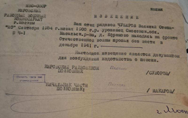 Боевой путь его начался 05.07.1941г. В рядах Народного ополчения от Кировского района он ушел на фронт. Принимал участие в Битве за Москву. Почледнее письмо, которое от него пришло было из района Бутово. В декабре 1941г он пропал без вести.