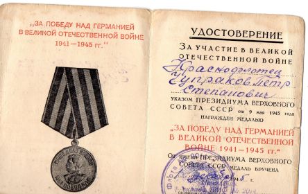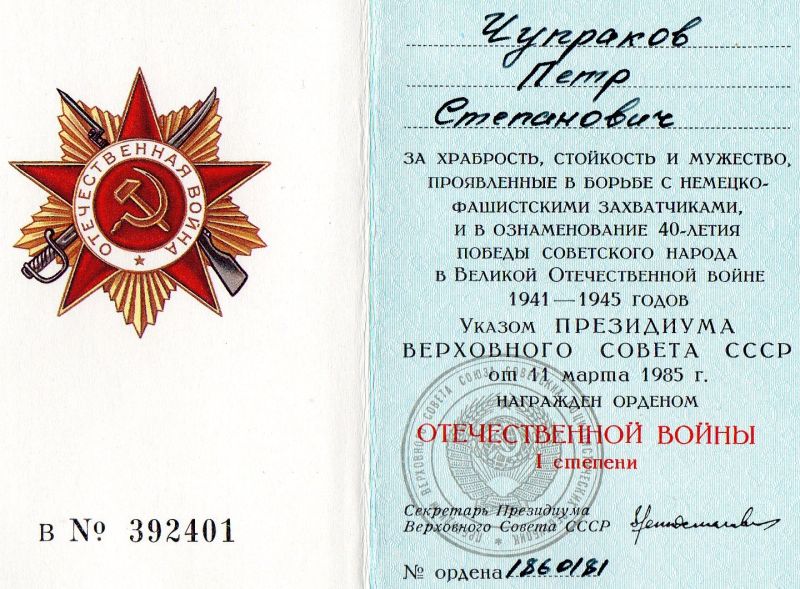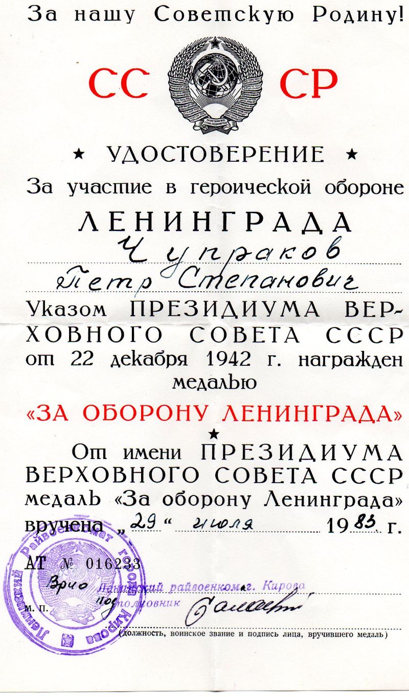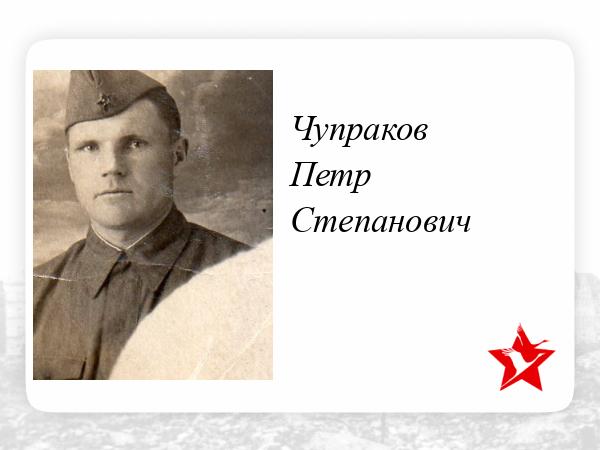 Мой отец Чупраков Петр Степанович родился 19.06.1910 года в Кировской области в деревне Чупраки Верховинского района Замежицкого сельсовета. Впервые в армию был призван 19.11 1932 г. стрелком в 46 погранотряд и служил по март 1935 г., где участвовал в борьбе с басмачами.19.11.1935 г. отца снова призвали в армию по мобилизации в 30 запасной артиллерийский полк заместителем политрука. Служил по май 1940. По его воспоминаниям, он участвовал в Финской кампании. А 19.07.1941 г. его призвали уже на Ленинградский фронт в 123 стрелковую дивизию 255 стрелковый полк. Полк вел бой в местечке Агалатово Всеволжского района за важный узел 22-го Карельского укрепрайона, где был ранен: он получил сквозное ранение левой половины грудной клетки.Осколок был рядом с сердцем, его не удалили. Так папа и жил с этим осколком. Он рассказывал, как очнулся в медсанбате/№168/, потом в эвакогоспитале 2222 и 74. В качестве витаминов раненым давали лук, было голодно, как и в блокадном городе. В конце мая 1942 г. отца переправили на Большую землю по Ладоге.Он был настолько истощен, как вспоминала мама, что из сильного широкоплечего мужчины он превратился в подростка ,и она от вокзала в г. Кирове буквально тащила его на себе. Отец имеет награды: Орден Отечественной войны 1 степени, медаль"За боевые заслуги", медаль "За оборону Ленинграда" и др. юбилейные медали. О войне говорил мало,всегда на глазах были слезы.
