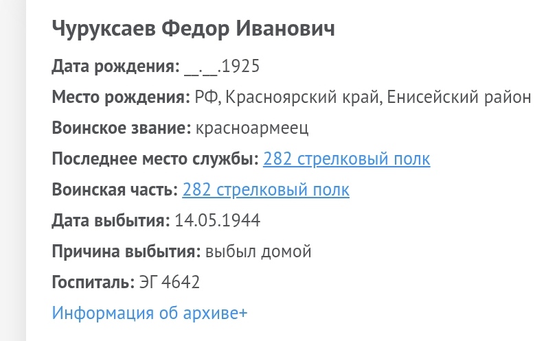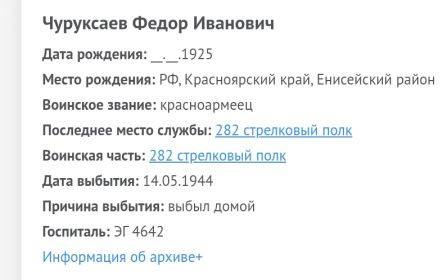 Чуруксаев Федор Иванович, 1925 г. р. Место рождения Красноярский край, Енисейский район, с. Плотбище. Призван Енисейским РВК в 1943 году. Красноармеец. Стрелок. В/ч 282 сп 92 сд. Тяжело ранен в январе 1944 года. ЭГ 4642, г. Казань. Комиссован по ранению в мае 1944 года. Инвалид войны, ампутирована нога. Награждён медалью За Победу над Германией в Великой Отечественной войне 1941-1945 гг., юбилейным орденом Отечественной войны 1 степени. Умер в 1991 году.