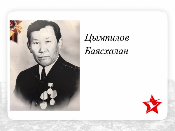 Цымпилов Баясхалан родился в 10 марта 1925 году в с. Южный-Аргалей Хойто-Агинского Сомона Агинского аймака в семье скотовода Цыденова Цымпила. В 1939 году закончил Аргалейскую начальную школу. В 1942 году окончил 7 классов в Агинской средней школе, дальнейшая учеба прекращена в связи с ВОВ. С июня 1942 года по декабрь 1942 года работал в колхозе им. Калинина учетчиком. С 20 декабря призван в Советскую Армию. В рядах советской армии с января 1943 года.