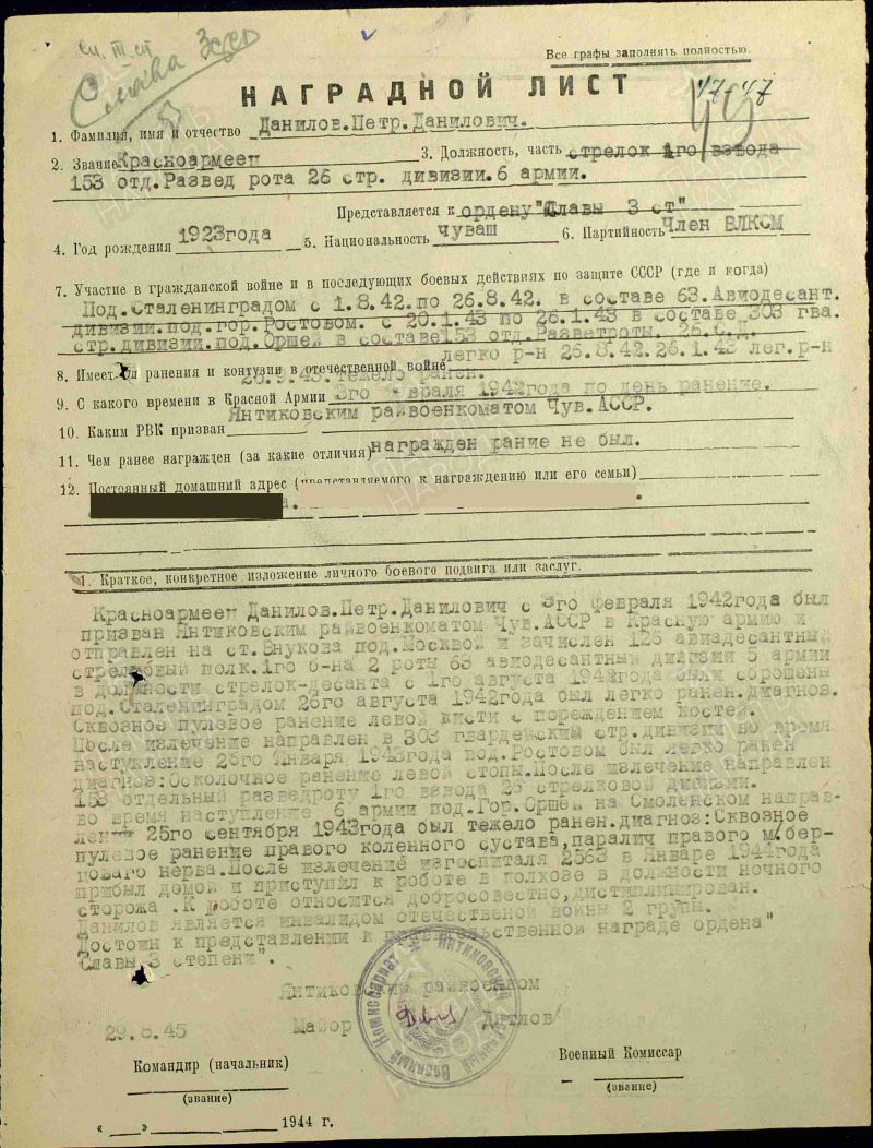 ДАНИЛОВ Петр Данилович 1923 гр, призывник, призван Янтиковским РВК 3.2.1942г. Был направлен на ст. Внуково Московской обл, где 25 воздушно-десантная бригада переформировывались в 126ой гвардейский стрелковый полк. Петр попал в 126 гв. сп 1 батальон 2 рота. Полк в составе 41 гв сд спешным порядком переброшен на СТАЛИНГРАДСКИЙ фронт, разгрузился под станцией Арчеда 14.08.1942г. Успешное наступление в малой излучине Дона. Петра записали погибшим 25.8.42г, в Клетском районе п. Перекопка, на самом деле был ранен 26.8.1942г, сквозное пулевое ранение левой кисти с поражением костей, после поправки 20.1.43г попал в 303 гв. сд, под Ростовом ранен 26.1.43г осколком в стопу, ЭГ 1662, после поправки попал в 1 взвод 153 оиптд-н 26 сд. Под г. Орша 25.9.43г тяжело ранен. Сквозное пулевое ранение правого коленного сустава, паралич правого м/берцового нерва, ЭГ 2563 12.1.44г выбыл в запас, инвалид 2гр.