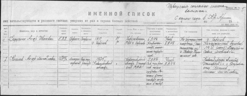 Призвали в Харькове в 1941 году. Закончил курсы танкистов. Служил танкистом, потом командиром танка. Несколько раз был ранен. После легкого ранения побывал дома в отпуске по ранению.Тяжелое ранение получил при попадании снаряда в его танк. Находился в госпитале. По документам умер в госпитале от перитонита. По рассказам очевидцев (местных жителей) - после прихода немцев в г. Невель всех раненых из госпиталя вывели и расстреляли.