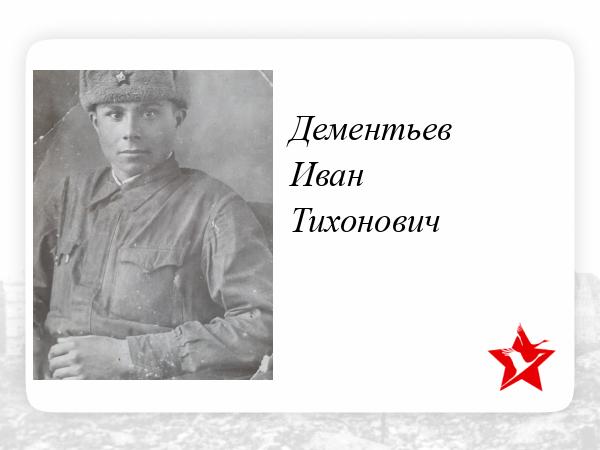 Мой дед,Дементьев Иван Тихонович 1923 года рождения ушёл на фронт добровольцем 04.10.1941.Он не дожидаясь повестки на фронт ,пошёл сам в военкомат.На фронте он был в звании сержанта второго стрелкового батальона 758 стрелкового полка.Присылая письма домой он был немногословен ,но из писем было понятно ,что на фронте было очень тяжело и страшно.За время службы в полку показал себя дисциплинированным,энергичным воином Красной Арими.При прорыве сильно укпюркпленной обороны противника Киреево -Горманы он как храбрый и смелый воин первым поднялся из своей траншеи и ворвался в немецкую траншею уничтожив 8 немецких солдат.Был награждён Орденом Красной Звезды и Орденом"Славы" третьей степени.На подступах к Восточной Пруссии был тяжело ранен.Отправлен в полевой эвакуационный пункт номер 89,где и умер от ран. В послевоенное время его семья начала разыскивать его место захоронения. И Капсукский РВК прислал извещение ,о том ,что он погиб Литовская ССР Мариямпольский уезд Кальварийский район д.Эглишки.Был первично захоронен 150 м. в братской могиле северо- восточнее д.Эглишке.Потом в 1946 его останки были перенесены на Калварийское воинское кладбище.И больше нашей семье о нем ничего неизвестно.Я очень благодарна деду за Победу ,за мирное небо над головой,за то что наши дети живут не зная всего ужаса ,через который прошли наши дедушки ,бабушки.Низкий поклон им!!!