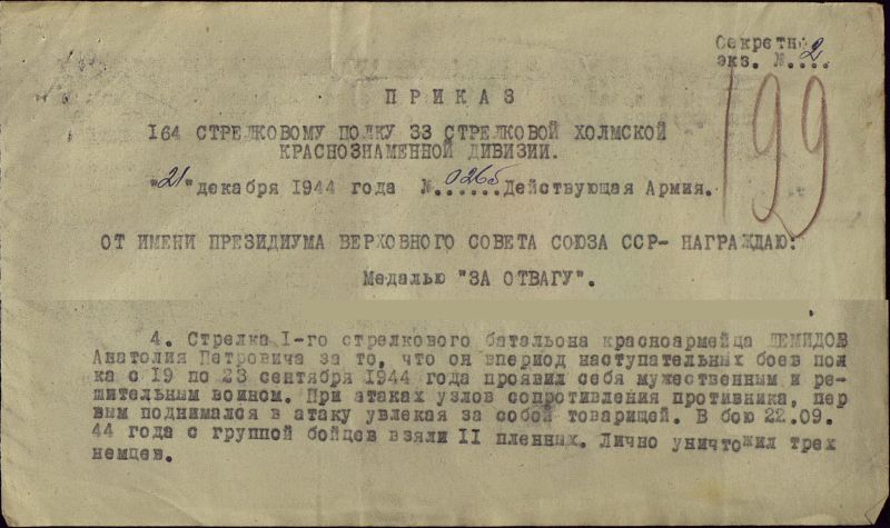 Мой дедушка, Демидов Анатолий Петрович - ветеран Великой Отечественной войны, ушел на войну из дер.Данилкино Красногородского района Псковской области (тогда - Великолукской), звание - старший сержант. Награжден медалью "За отвагу", Орденом Отечественной войны I степени. На войне был тяжело ранен, - врачи удивлялись, как можно с такими ранениями работать и жить. После войны дедушка работал в школе учителем русского языка и литературы. Его уважали и ценили в школе, ученики - любили, он умел привить серьезное отношение и интерес к своим предметам. Коллеги и друзья считали дедушку прямым и справедливым человеком. Он всегда высказывал свое мнение, никогда не молчал, если видел несправедливость. Для моего отца дедушка был непререкаемым авторитетом, человеком, на которого нужно равняться, которому можно верить. Папа тоже стал учителем русского и литературы, и, характер у него тоже, как и у его отца. Дедушка умер, когда мне было 7 лет. Помню, как он играл со мной, читал книжки, рассказывал разные истории - но никогда про войну. Только из архивных документов я узнала о его подвиге: "...в период наступательных боев полка... проявил себя мужественным и решительным воином. При атаках узлов сопротивления противника первым поднимался в атаку, увлекая за собой товарищей. В бою 22 сентября 1944 года с группой бойцов взяли 11 пленных. Лично уничтожил трех немцев". Я помню своего дедушку, горжусь им! Пока бьется мое сердце - в нем будет жива память, гордость, благодарность за мир!