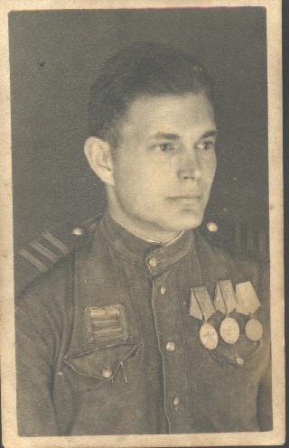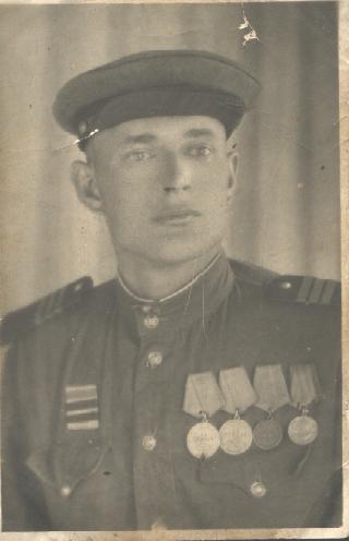 Призван на службу в 1939 г. Участвовал в Советско-Финской войне, затем в ВОВ с июня 1941 по май 1945г., 2 морская бригада 98 стрелковая дивизия 166 стрелковый полк пом. ком. взвода; 941 артилерийский полк 372 стрелковая Новгородская дивизия санинструктор. 1944г. Ленинградский фронт, заканчивал войну в составе 2-го Белорусского фронта. Был несколько раз ранен. Награды: 2 медали "За отвагу", медаль "За оборону Ленинграда", медаль "За победу над Германией", Орден Отечественной войны I степени. Домой вернулся в мае 1946