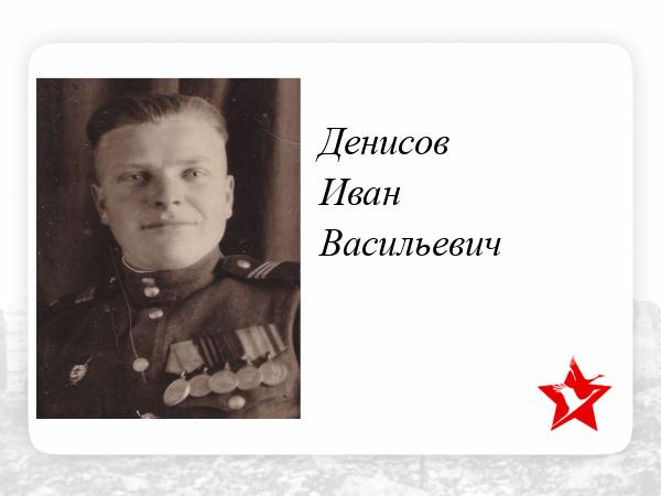 Мой отец, Денисов Иван Васильевич, родился 23 сентября 1926 года в селе Знаменка Знаменского района Кировоградской области. В 1941 году закончил 8-й класс Еленовской средней школы Ольгинского района Сталинской области и до сентября 1943 года проживал на оккупированной немцами территории. После освобождения Донбасса записался добровольцем в Красную армию, и уже 27 сентября 1943 года, сразу после своего 17-летия, был принят на военную службу. Сначала служил в тылу, а с февраля по 10 мая 1945 года, будучи командиром минометного расчета, принимал участие в боевых действиях в составе 285 минометного полка (командир полка подполковник Беленький С.С.). Боевой путь – форсирование реки Нейсе, взятие города Виттенберг, окружение и взятие Берлина, и, наконец, освобождение Праги. За участие в боях награжден медалями “За отвагу”, “За взятие Берлина”, “За освобождение Праги”, “За победу над Германией”, неоднократно объявлялись благодарности командования.