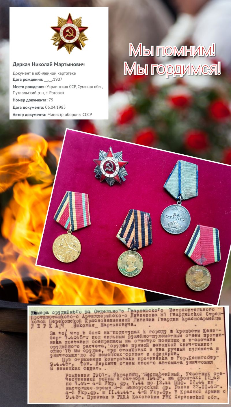 За участие в боях на подступах к городу и крепости Кенигсберг 7.04.1945 года, когда под сильным ружейно пулеметным огнем противника доставил боеприпасы на огневую позицию и в составе орудийного расчёта, орудие прямой наводкой уничтожило: одно 75 мм орудие, 3 станковых и 2 ручных пулемёта и уничтожило до 30 немецких солдат и офицеров.