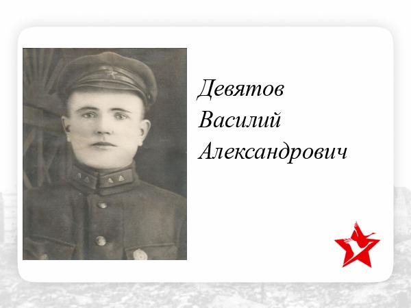 Мой прадед Девятов Василий Александрович родился в 1904 году в деревне Старые Бакуры Малмыж ского района Кировской обл. Призван Малмыжским РВК Кировской области. Проходил службу в составе 8-го отдельного гвардейского истребительно-противотанкового дивизиона 61 армии 1-го Белорусского фронта на должности командир отделения ПТР в звании младший сержант. 16 февраля 1942года был ранен. 8 июня 1944 года был награжден медалью «За Отвагу» за то-что в бою за дер. Белый Берег 3 февраля 1944года уничтожил из противотанкового ружья пулемёт противника вместе с расчётом. 25 июля 1944 года близ дер. Власне Брестского района Брестской области Белорусской ССР мой прадед был убит. Захоронен там-же в братской могиле. Не так давно я узнал, что эта братская могила была перезахоронена, но куда не известно. Сейчас ищу информацию об этом. Очень тяжело что-то узнать, когда не у кого спросить. Бабушка умерла когда я был ещё маленьким, дедушка был с раннего возраста глухонемым и по этому какие-то подробности от него узнать так-же было очень проблематично. Я и в дальнейшем буду дополнять эту статью те что смогу найти. Такие люди как мой прадед не должны быть забыты. Мы обязаны помнить их, их подвиги и гордиться ими.
