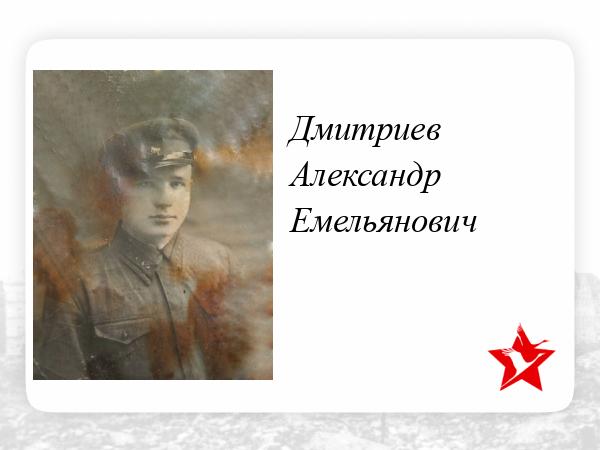Мой дедушка Дмитриев Александр Емельянович родился в 1919 году в Казахстане , в Алмаатинской области.Был призван в ряды РККА в 1940 году Яныкурганским РВК Кзыл-Ординской области.В то время он работал инспектором райфинотдела.Провожали его в Армию жена Дмитриева Анна Филипповна , дочь Эмилия и сын Юрий. Служил дед на брест Литовской границе.В письмах жене анне он писл , что наверное скоро начнется война." Я вас очень люблю!Главное , Аня береги детей!"Войну встретид Александр Емельянович в Бресте.Долгое время считался пропавшим безвести.Бабушка Аня ждала его всю вою жизньОднажды знакомые с почты решили над ней подшутить и принесли ей фальшивую телеграмму, что муж ее Сашенька возвращается домой.Бабушка несколько дней ходила на вокзал , встречала все поезда, пока "доброжелатели" не сказали, что они просто решили подшутить над ней.Это был 1943 год.Не было ни одного дня чтобы бабушка не вспоминали своего любимого Сашеньку, до самой своей смерти в 2006 году.бабушка научила нас большой и светлой любвиюОна рассазывала, что когда Александр Емельянович привез ее знакомится со своими родителями , они приехали поздно вечером.а утром . когда она вышла в большой яблоневый сад, то увидела что все яблоки подисаны ее именем. Свекровь сказала тогда им - быть вам вместе до самой смерти. И умирая бабушка говорила- "Ского я увижу Сашу!" В архивах МО значится что Дмитриев Александр Емельянович пропал безвести у города Молодечно .