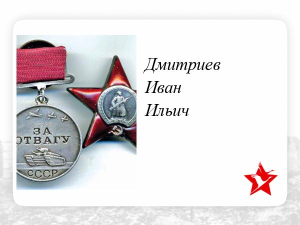 Дмитриев Иван Ильич-политрук пулеметной роты 110-го Стрелкового полка 52-й Стрелковой дивизии в боях с 22.06.41г. 28 июля 1941 года при контратаке под д. Истонки был тяжело ранен и эвакуирован в тыл. После госпиталя слушатель Военно-Юридической Академии Красной Армии. Награжден медалью "ЗА ОТВАГУ" от 16.11.44г. К 40-летию ПОБЕДЫ награжден орденом "ОТЕЧЕСТВЕННОЙ ВОЙНЫ" 2-й степени от 06.04.85г. Медаль «За боевые заслуги» от 20.06.1949г. Орден Красной Звезды от 30.04.1954г. Этот фронтовик мой односельчанин.