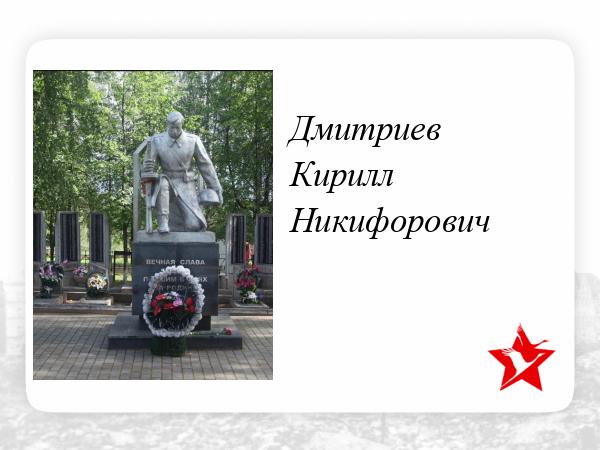 Дмитриев Кирилл Никифорович-гв.красноармеец 139-й Гв. СП 46-й Гв. СД погиб 17.03.44г.д. Каменка Пустошского р-на Калининской обл.В 1956г перезахоронен в центр г. Пустошка. Имя на обелиске БМ.