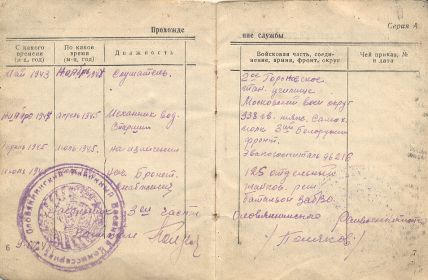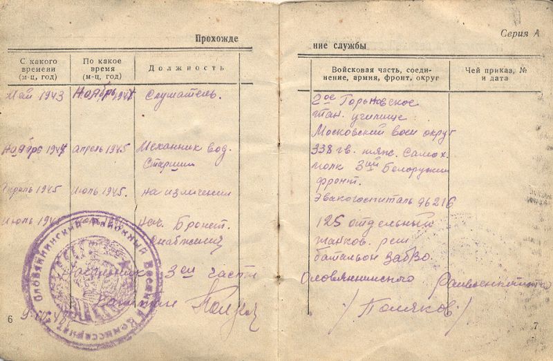 1944 – 1945 Старший механик водитель 338 Гвардейский тяжелый самоходный полк 3-ий Белорусский фронт http://dic.academic.ru/dic.nsf/ruwiki/601073